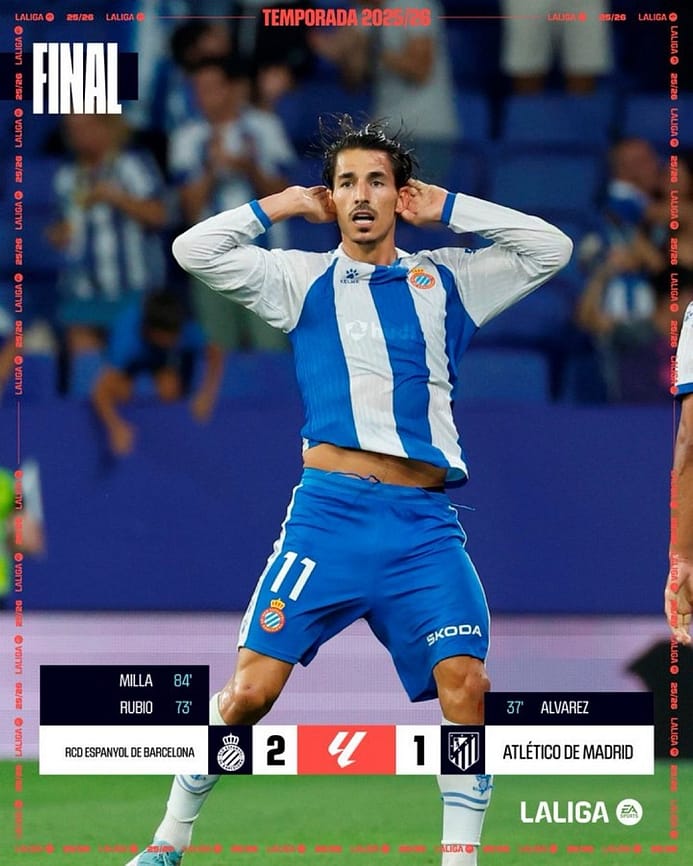 En lo futbolístico, el Espanyol mostró carácter, trabajo colectivo y un plan muy claro: resistir en la primera parte y golpear en la segunda. Miguel Rubio fue un coloso atrás y decisivo arriba, Expósito un faro en la medular, y Pere Milla, el héroe inesperado que convirtió una noche cualquiera en una velada histórica. En el Atlético, en cambio, las dudas se disparan: el equipo mostró calidad y dominio, pero pecó de falta de contundencia para cerrar el partido y de cierta fragilidad en defensa, especialmente en los balones laterales. Simeone tendrá que ajustar piezas, porque este tropiezo en el arranque le obliga a remar a contracorriente desde el inicio.